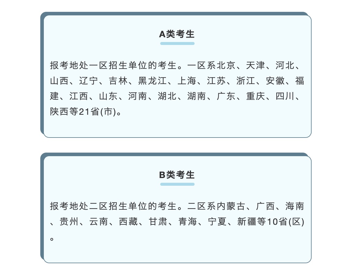 目前国家的教育发展还不均衡,为了相对公平,把全国31个省市自治区分为两类,分别为一区和二区。当然报考地处一区、二区招生单位的考生,分别为A类考生和B类考生。(如果报考A类地区的考生总分或单科分数没过,可以报考B类地区的调剂。)