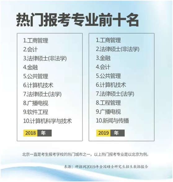 虽然应届生仍然是考研的主力军,但是随着在职研究生纳入统考后,以及往届生对于提高自身就业竞争力的需求增加,往届生的考研比例也逐年提高。自2017年在职研究生纳入统考后,在职考生的积极性空前高涨。随着社会各界对专业学位硕士认可度的提高,越来越多在社会上摸爬滚打几年,或者逐渐走上管理岗位的职场人,选择回归考研的大军,希望通过考研提升自身的竞争力,让人生拥有更多的选择。从热门报考专业分布看,工商管理、会计、公共管理、工程管理等管理类专业越来越受到考生的青睐。若真要等哪一年报考人数减少再考,可能就今年了。